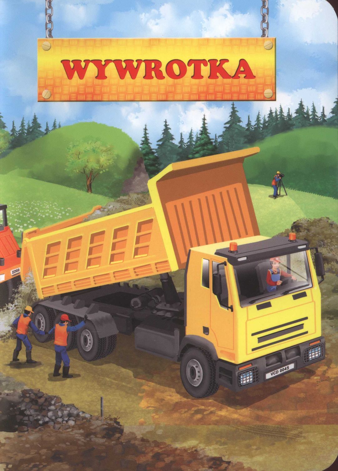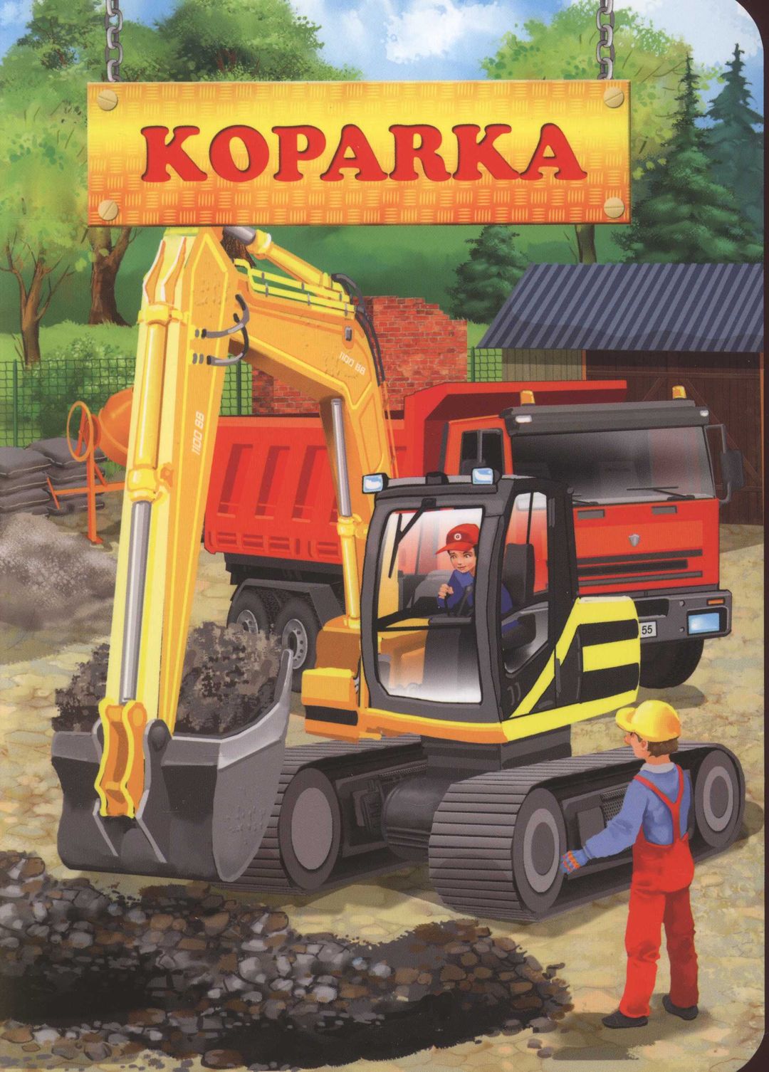 Książeczka kartonowa z kolorowymi ilustracjami, dla najmłodszych czytelników, o Radku i jego pracy z koparką.